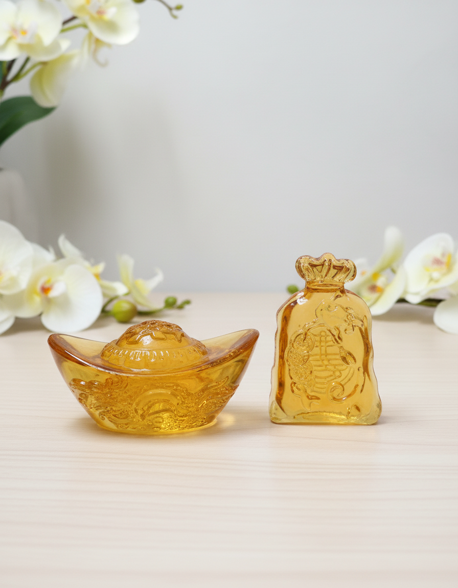 INGOT WEALTH TOGETHER combines a Feng Shui ingot and money bag, designed to enhance financial prosperity. These elements should be placed in areas associated with wealth, such as the southeast corner of your home. Proper use and placement can potentially increase abundance and financial stability by aligning with traditional Feng Shui principles.